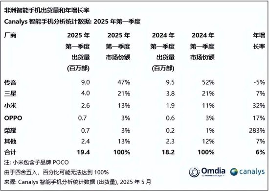 市场调研机构Canalys统计,2025年一季度,传音智能手机仍稳居非洲市场第一,但其市场占有率已从2024年一季度的52%降至47%,是前五名中手机出货量唯一下滑的公司。