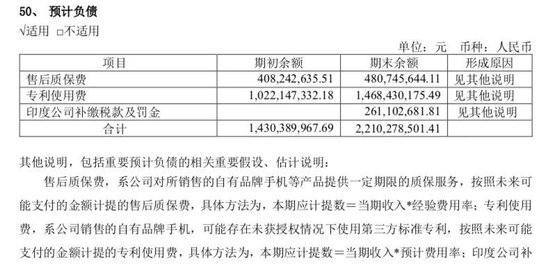 传音控股历年财报将专利使用费纳入预计负债,即“公司销售的自有品牌手机,可能存在未获授权情况下使用第三方标准专利,按照未来可能支付的金额计提的专利使用费”,具体方法为:本期应计提数=当期收入*预计费用率。