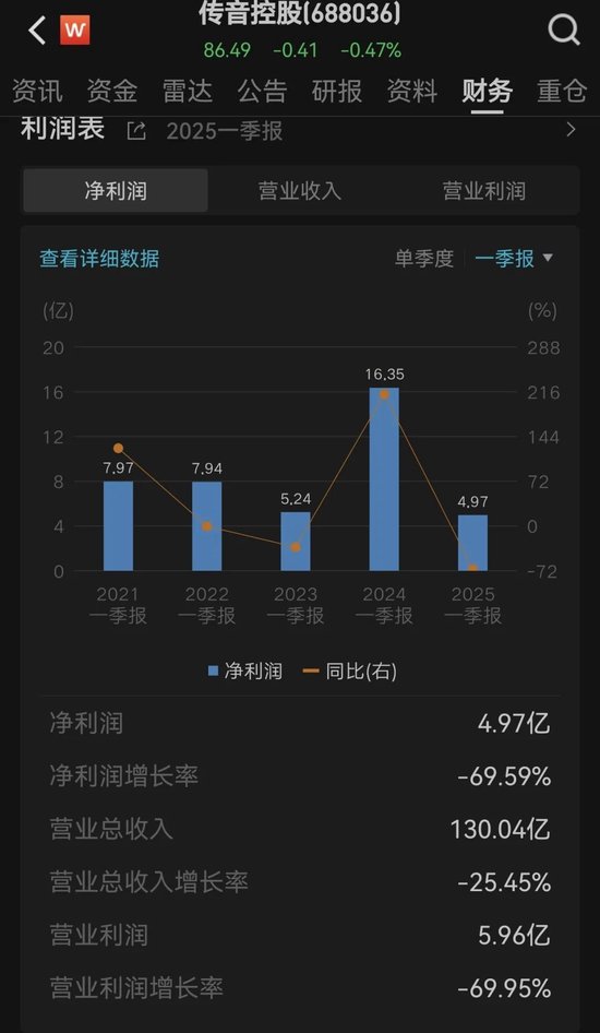 2025年一季度,该公司营收为130.04亿元,同比下降25.45%;净利润4.97亿元,同比下降69.59%。至此,传音控股已连续三个季度出现营收、净利双降的趋势。
