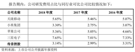 上市前,传音控股的研发费用投入就低于同行。于2016年至2018年的研发费用分别是3.85亿元、5.98亿元、7.12亿元,研发费用占总营收比重仅3%左右;同期对应销售费用则分别是9.33亿元、19.45亿元、22.54亿元,是研发费用的两倍,甚至三倍。
