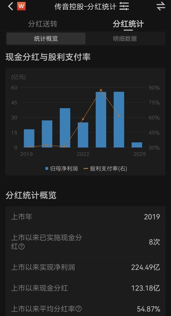 Wind数据显示,传音控股自2019年上市以来实现净利润合计224.49亿元,累计实施8次现金分红总计123.18亿元,平均分红率54.87%。
