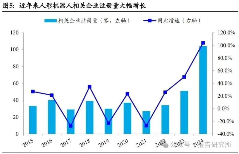 人形机器人从概念验证走向规模落地,相关企业注册量大幅增长。2022 年,特斯 拉作为行业先行者推出 Optimus 原型机,全球人形机器人产业进入快速发展期。 2022-2024 年,继特斯拉之后,国内外大量企业进入人形机器人领域,形成了多元 化竞争格局。据企查查数据,2024 年国内人形机器人企业注册量为 104 家,同比 增速达 104%,人形机器人相关企业注册量大幅增长。
