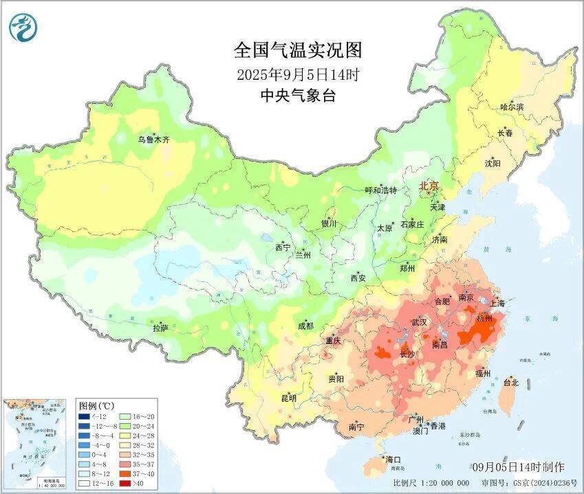 而南方在副热带高压控制下,高温盛行。截至14时,浙江建德最高气温达40℃,热度同期少见。此外,杭州今天再度出现高温,已是连续高温34天,即将打破观测史纪录(2022年7月20日至8月23日连续35天)。武汉和南昌今年以来的高温日数也都追平了当地全年高温日数最多纪录,未来如果还有高温,两城市都将刷新纪录。