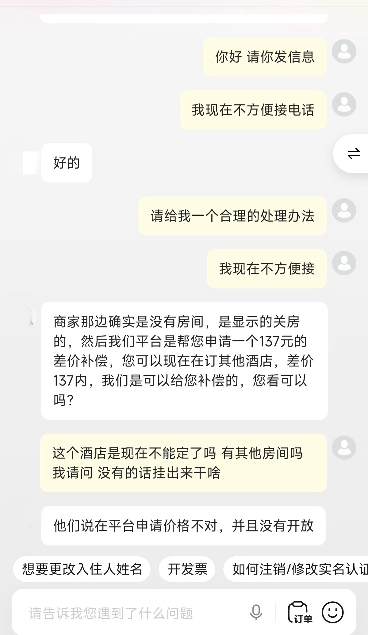 小冰向客服投诉后,客服表示,经与商家沟通,对方称房源已关房无房可住,平台可为其申请137元的差价补偿,用于更换其他酒店。“客服说要等我入住之后才能补,现在不能直接赔付。”